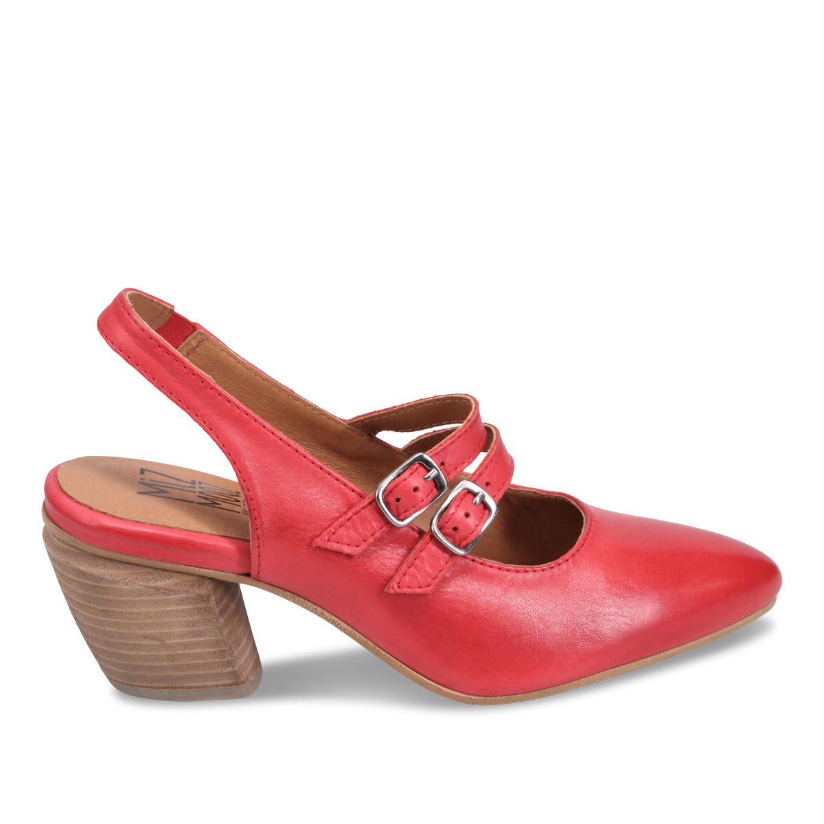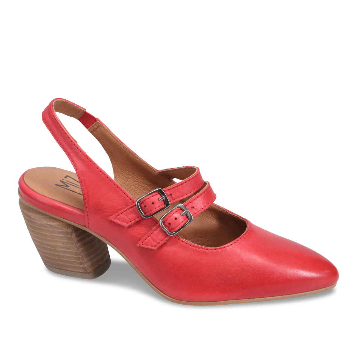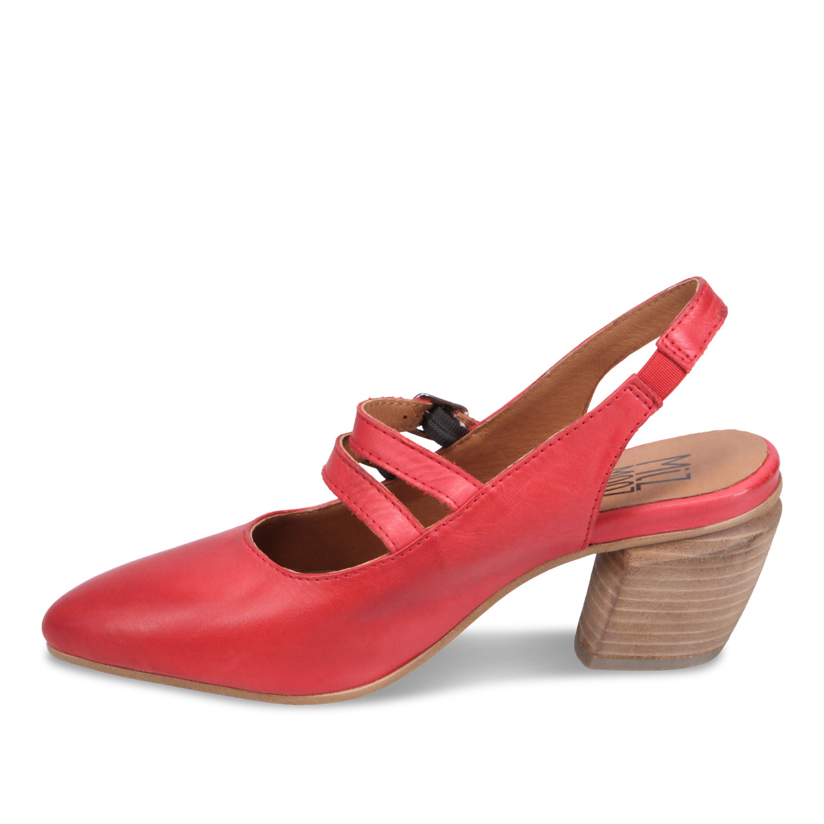 Our favourite sturdy wedge-like heel supports this almond-toed slingback double Mary Jane. Perfect for peeking out from your flared jeans or with a skirt and tights for a complete office look.