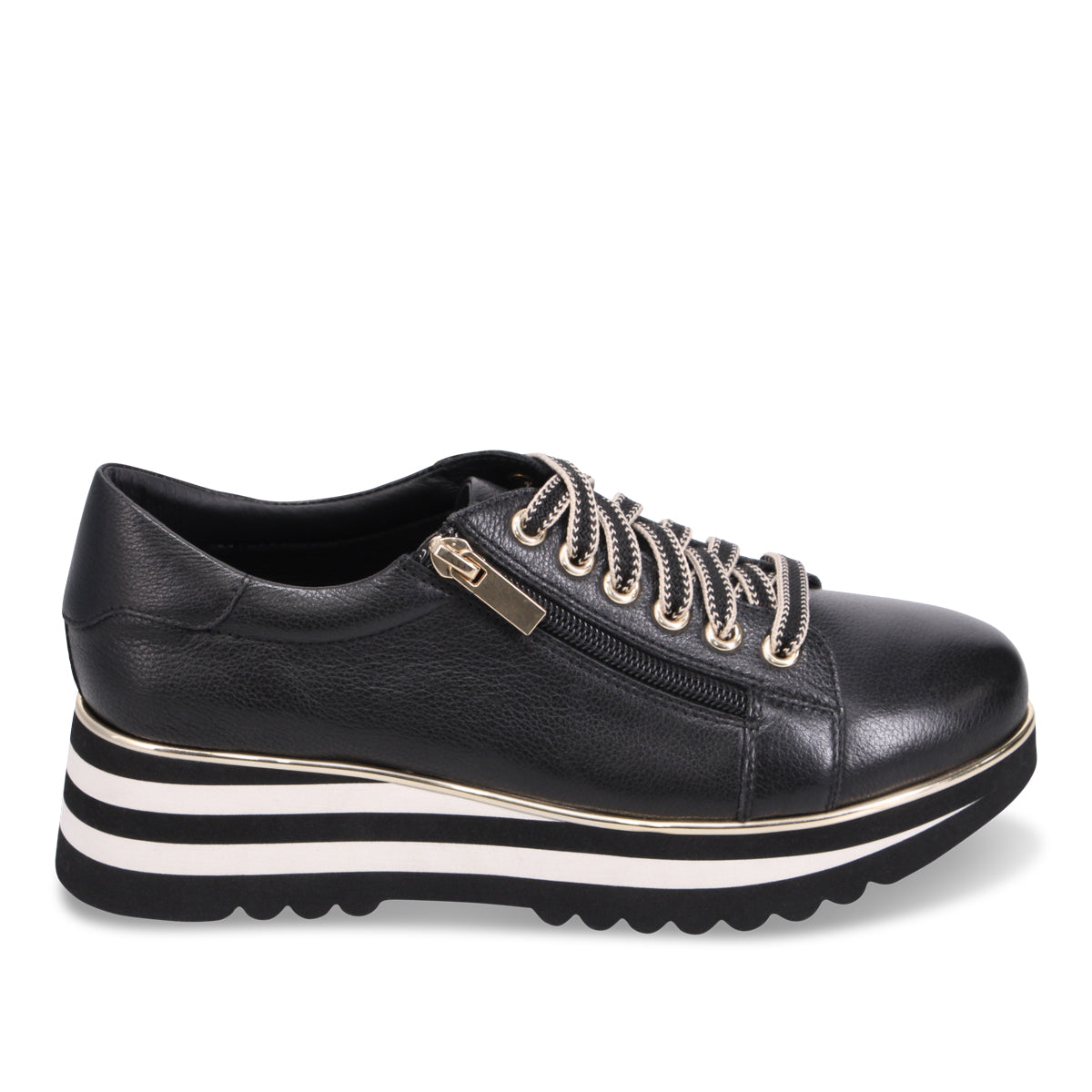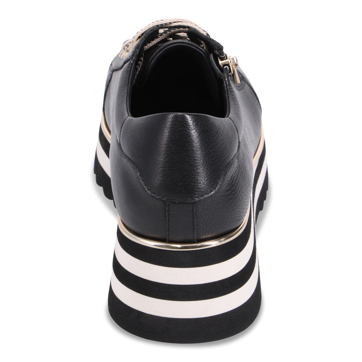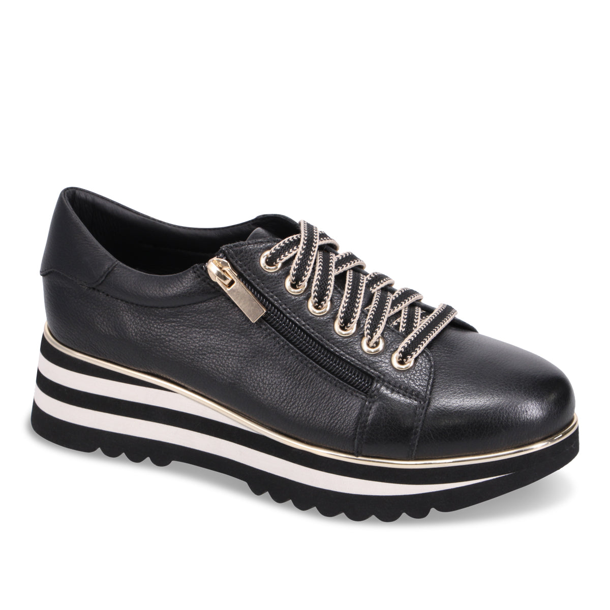 Eammes, where sporty meets statement. This platform sneaker amps up the everyday with bold striped soles, metallic accents, and a side zipper that adds just the right touch of edge. The lace-up front ensures a snug fit, while the elevated sole brings comfort and a boost of confidence. Perfect for adding height without heels and style without trying.