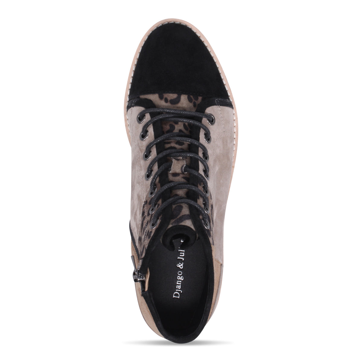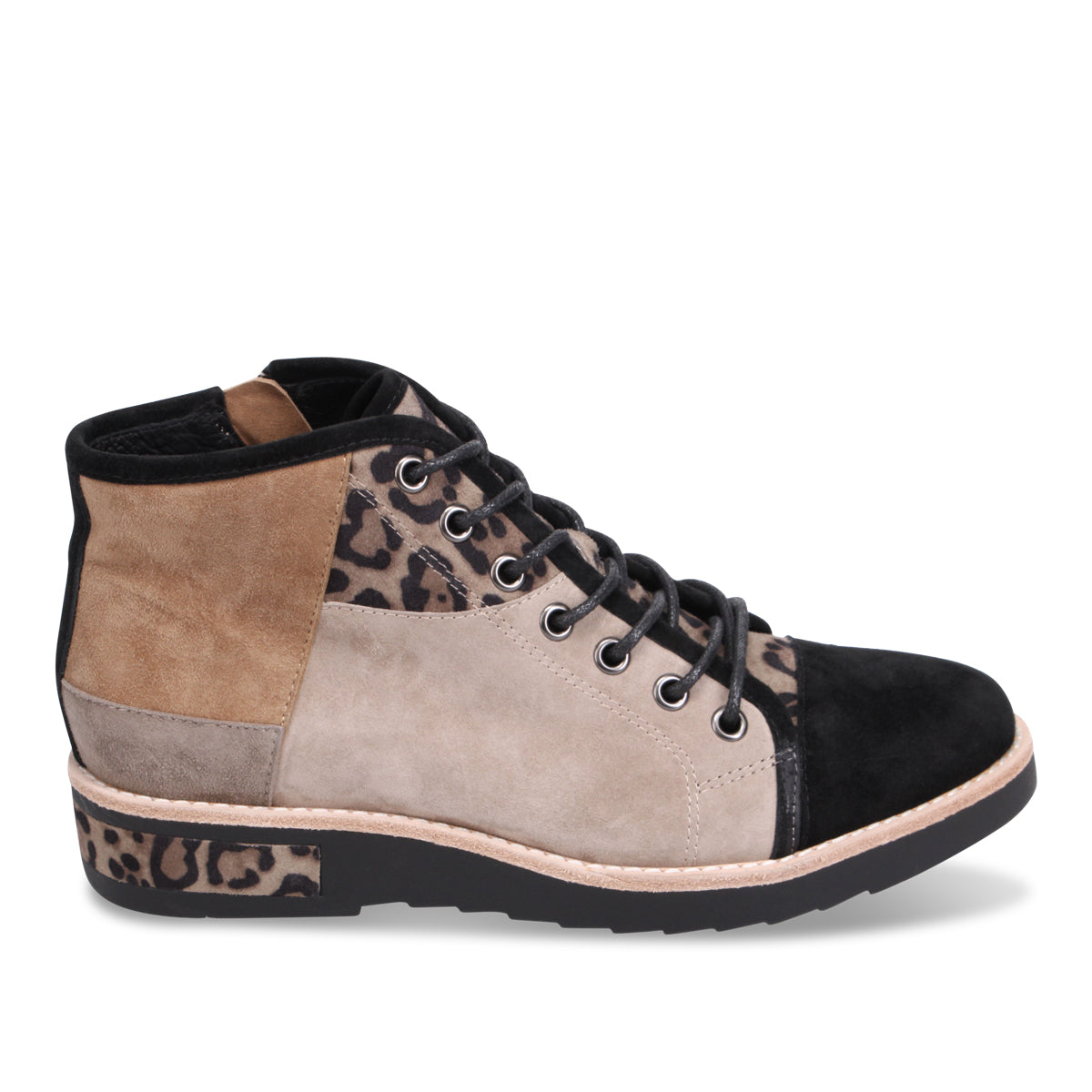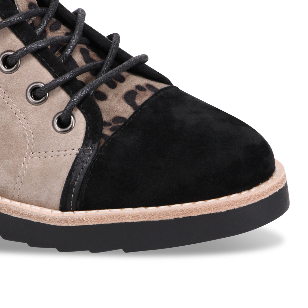 Regine is adventure-ready with a wild side. This lace-up boot combines rugged functionality with bold fashion, thanks to its mixed materials and eye-catching leopard print accents. The layered panelling adds visual depth, while the sturdy sole and cushioned footbed offer comfort built for all-day wear. With its secure lace-up fit and standout style, this boot is made for city streets, weekend escapes—and turning heads wherever you go.