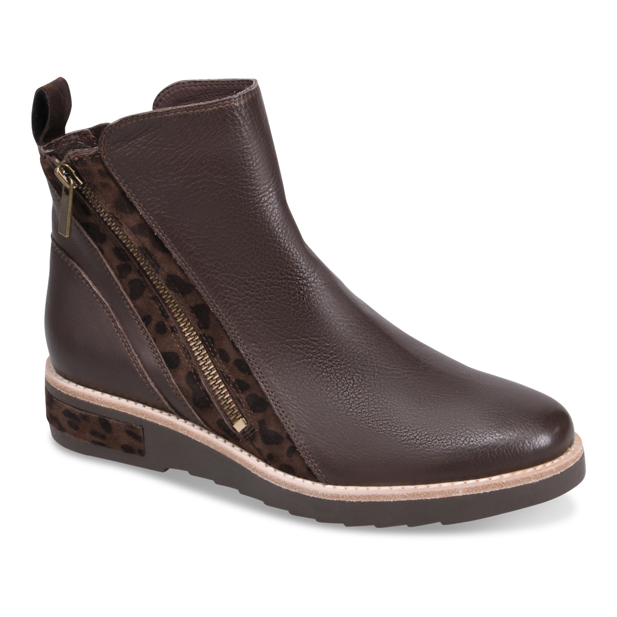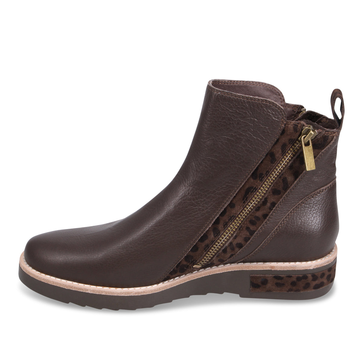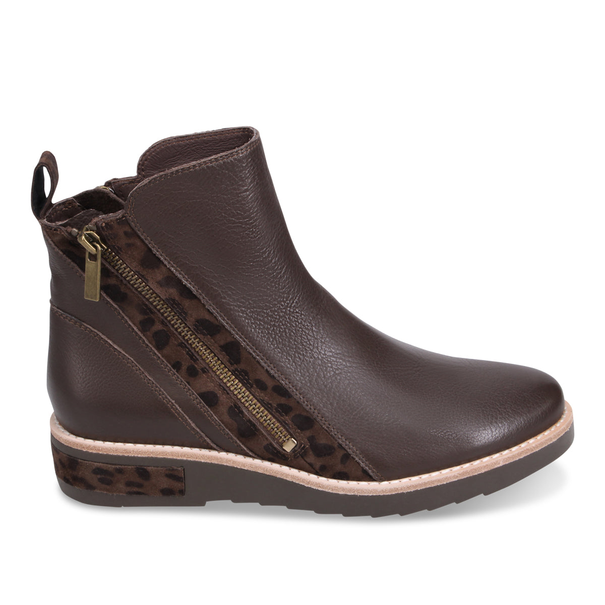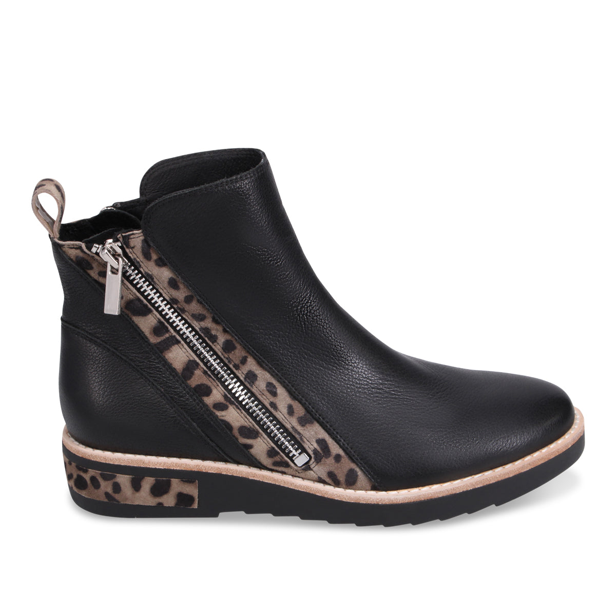 Rhain is sleek and minimal at first glance, but it surprises with bold leopard print accents along the zipper and sole for a fierce finish. The angled side zip makes slipping in and out a breeze, while the low wedge sole adds subtle lift and all-day comfort. It’s the perfect boot for when you want classic function—with just enough roar.
